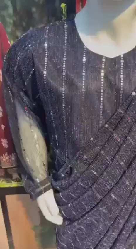 الوصف: ساري أنيق باللون الأسود من قماش "مون لايت" مصمم خصيصاً للأطفال. هذا الطقم المكون من 3 قطع مخيط بالكامل وجاهز للارتداء. يتميز ببلوزة ذات سحاب خلفي وتنورة داخلية (بيتي كوت) متصلة لراحة وأناقة تامة.